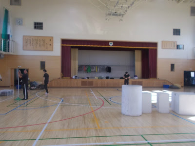 劇団の皆さんが、児童の登校前に来校され、会場となる体育館で準備を始めました。